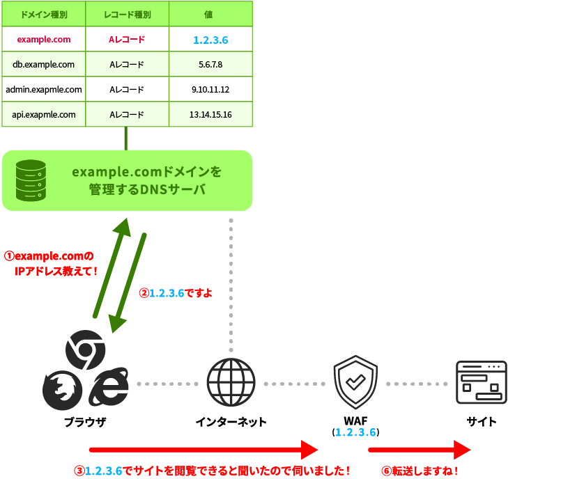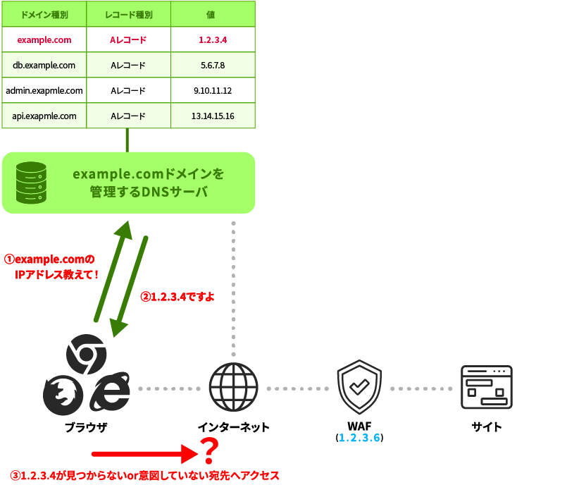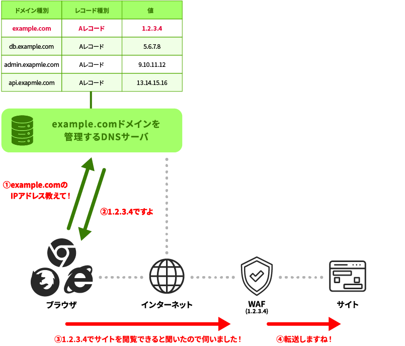 - IPアドレスの直接利用: ネイキッドドメインに対してAレコードを設定する方法です。前述したようなサービスの可用性に関する懸念やそのリスク軽減を目的とした追加コスト、そして実際に問題が発生した場合の対応コストなどをサイト運営側にて許容することが前提となります。通信自体は可能ですが、多くのWAFベンダーでは推奨されていない方法です。