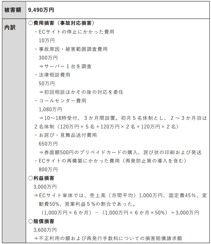 実際に事故対応で発生する費用2,890万円以外にも、売上利益の損害3,000万円やクレジットカード会社からの損害賠償3,600万円が加わり、合計の9,490万円の被害額が一度の情報漏えいにより発生しています。