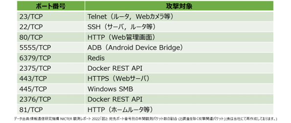 国立研究開発法人 情報通信研究機構による「NICTER観測レポート2022」の発表によると、外部公開環境への主な攻撃対象は以下の表の通りとなっており、様々な対象へ攻撃が行われていることが読み取れます。