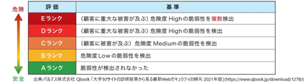 弊社の脆弱性診断サービスでは、実現可能性と被害影響の大きさからリスクをHigh/Medium/Lowの3段階に分別し、検出傾向によりサイトの総合的な危険度を評価しています。危険度評価は以下の表の通りです。