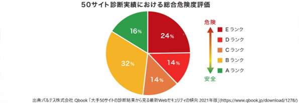 調査対象の過半数となる52%で、顧客に被害が及ぶシステムの脆弱性が検出されました。これは 2サイトの内、およそ1サイトに危険な兆候が見つかったことになります。また、危険度Low まで含めると何らかの脆弱性が見つかったサイトは全体の84%にもなりました。