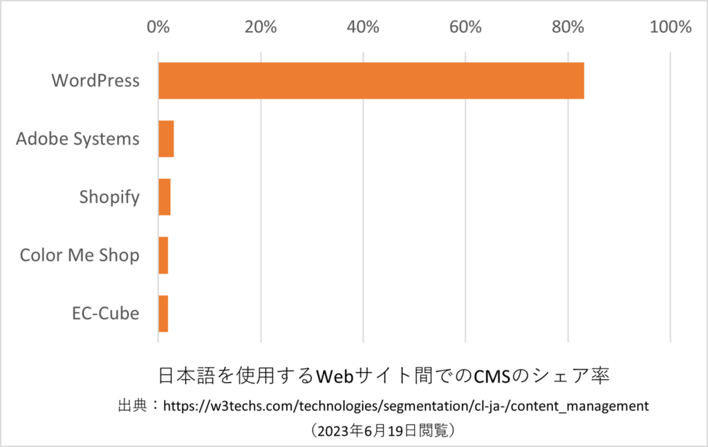 WordPressとは、ブログやコーポレートサイト等様々なタイプのWebサイトを作成できるCMS(Contents Management System)です。W3Techsの調査によると、WordPressは日本語を使用するサイトで約80%のシェアを誇り、多くの方が使用しているものと考えられます。