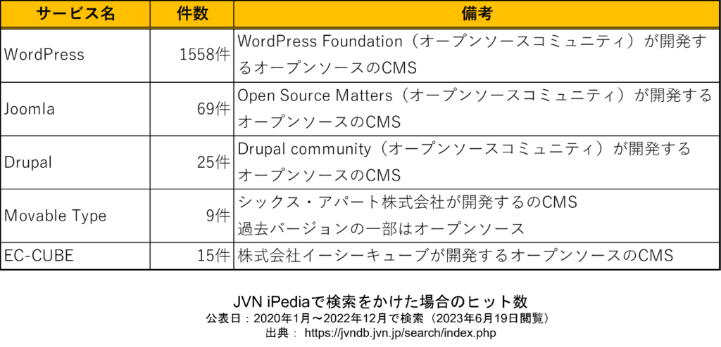 この表から、他のCMSに比べてWordPressの脆弱性の情報が多いことがわかります。