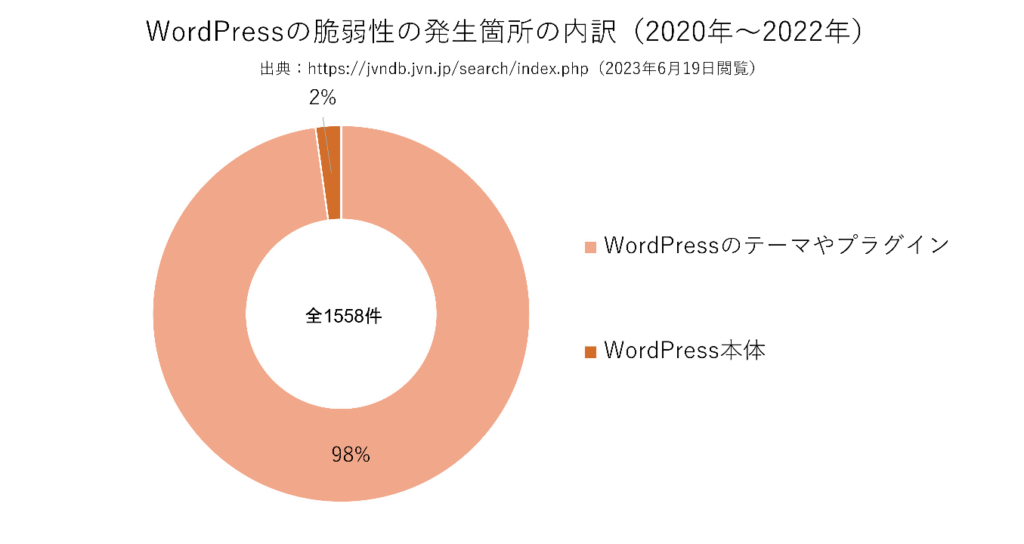 WordPressの脆弱性のうち、約98%がテーマやプラグインの脆弱性となり、殆どがWordPressのテーマやプラグインの脆弱性であることがわかりました。これより、テーマやプラグインの脆弱性が、WordPressの脆弱性の多さの要因のひとつであることがわかります。