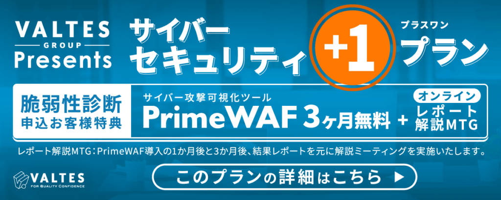 日を追うごとにセキュリティに関するニュースが世間を賑わせています。この度弊社では、よりセキュリティに関する意識を高めていただきたいという思いから、バルテスの脆弱性診断を実施していただいたお客様限定でクラウド型WAFのPrimeWAFを無料で3か月間使えるプランを開設しました。また、このプランでは、PrimeWAF導入の1か月目と3か月目に、PrimeWAFのレポートを元にしたセキュリティ状況の解説MTGも実施いたします。