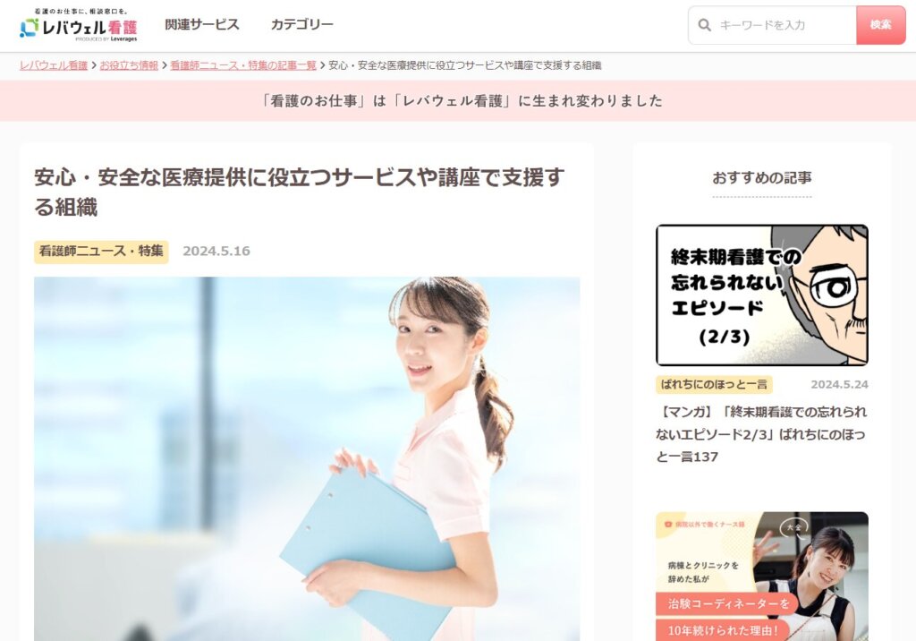 「安心・安全な医療提供に役立つサービスや講座で支援する組織」として、看護師求人紹介サービス「レバウェル看護」に掲載されました。